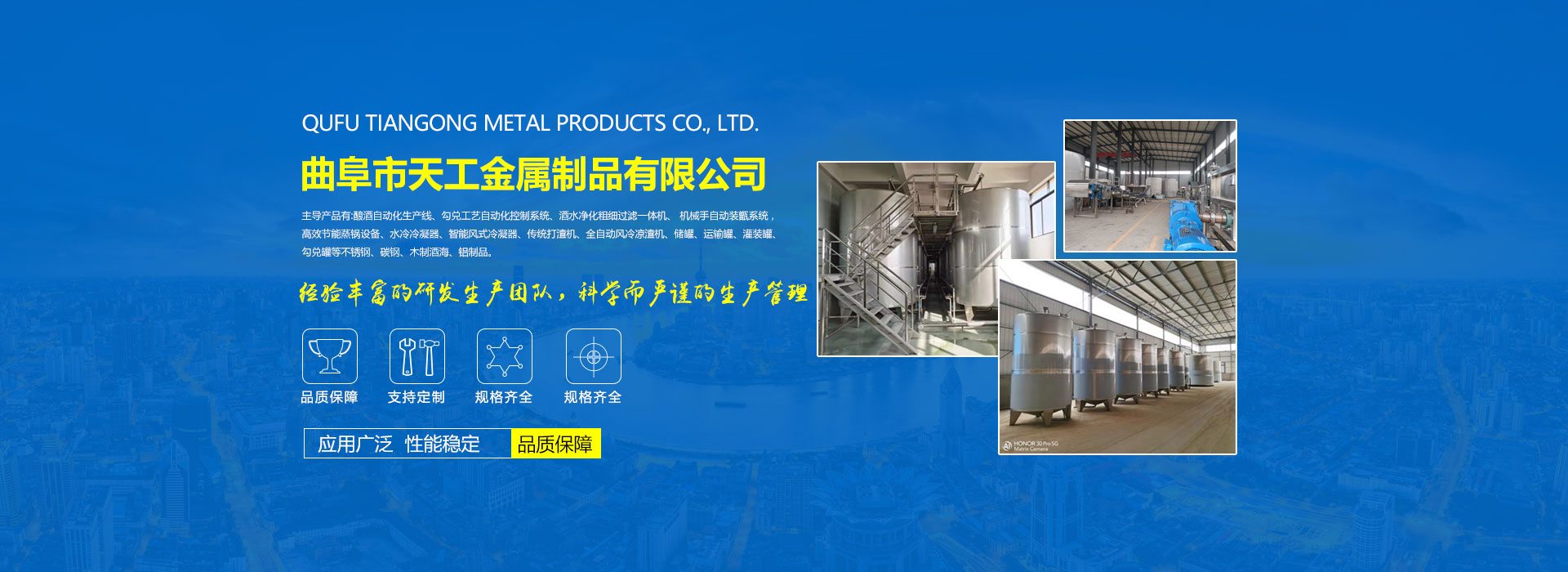 本公司是專業生產不銹鋼酒罐、不銹鋼釀造設備、不銹鋼發酵罐、釀酒、食品、生物、化工、環保設備、制藥設備的廠家。主導產品有:釀酒自動化生產線、勾兌工藝自動化控制系統、酒水凈化粗細過濾一體機、?機械手自動裝甑系統,高效節能蒸鍋設備、水冷冷凝器、智能風式冷凝器、傳統打渣機、全自動風冷涼渣機、儲罐、運輸罐、灌裝罐、勾兌罐等不銹鋼、碳鋼、木制酒海、鋁制品。各種反應釜、發酵罐、提取罐、氣體混合罐、烘干設備等大中型設備安裝,平臺制作、工藝管線制作安裝,容器設備內外防腐保溫。產品規格齊全,質量可靠。